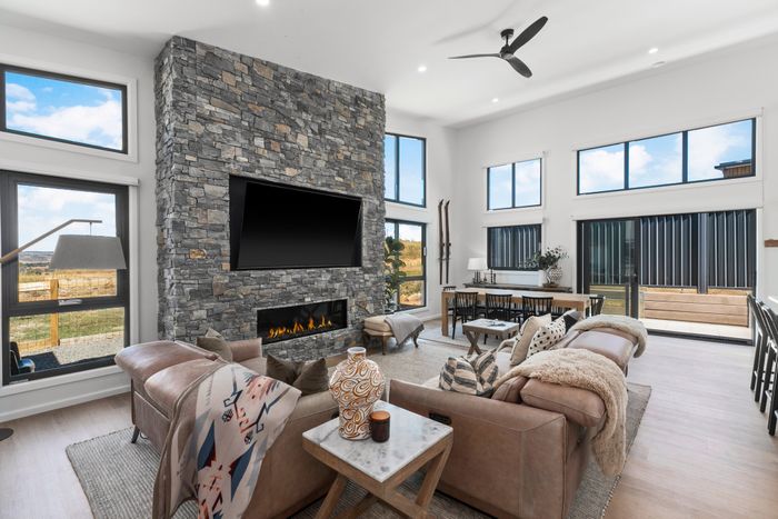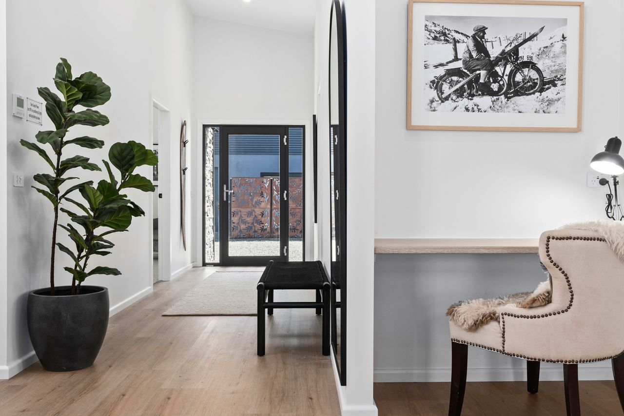Step into elegance with vaulted ceilings and abundant light. The stunning stonework fireplace offers peaceful views across Jindabyne's hills. Our open-plan living boasts captivating south-east mountain views. Outside, enjoy dining for eight, a fire pit, and a mountain bike washing facility – venture out the back gate and explore walking trails leading to lake views.