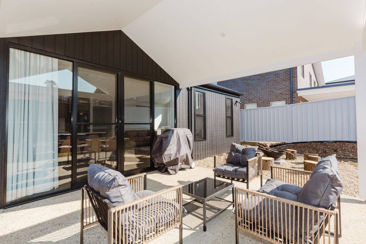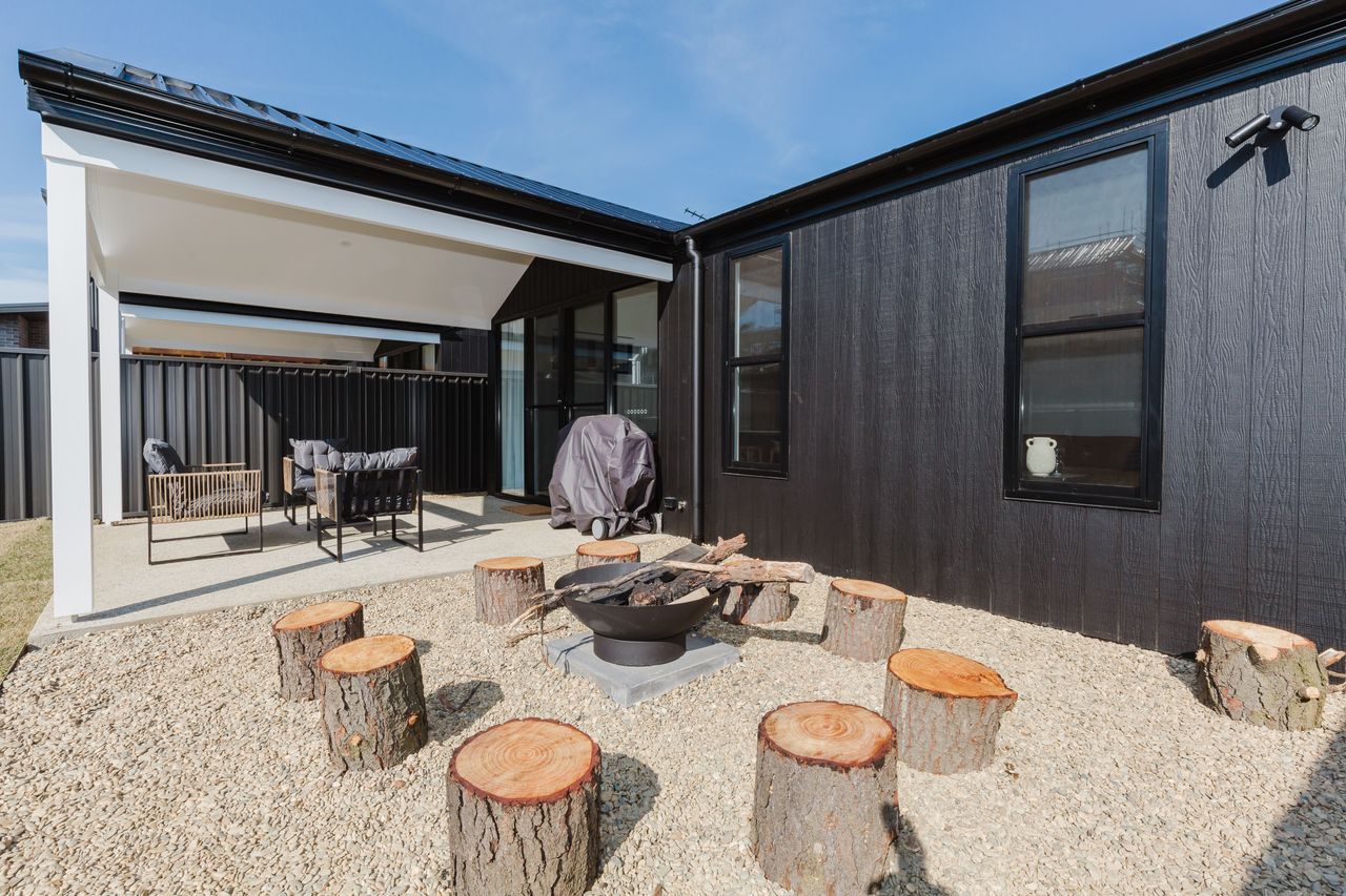 Outside, the covered alfresco area includes a BBQ, fire pit, and a beautifully landscaped yard, offering a perfect place to unwind after a big day of mountain adventure.
