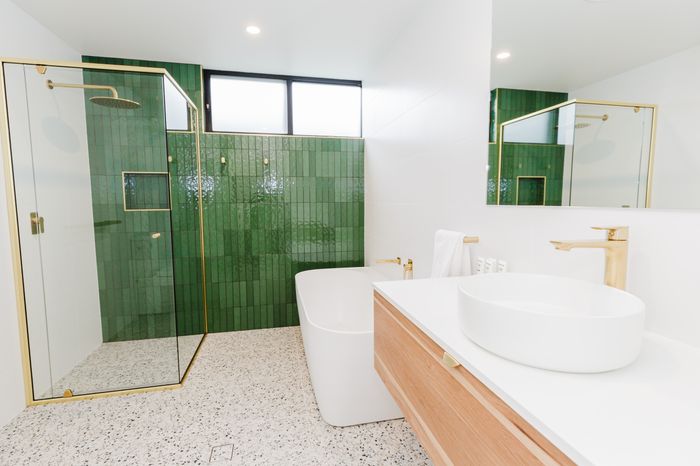 The main bathroom includes a deep soaking bathtub, ideal for relaxing tired muscles, plus there's a third guest toilet in the laundry.