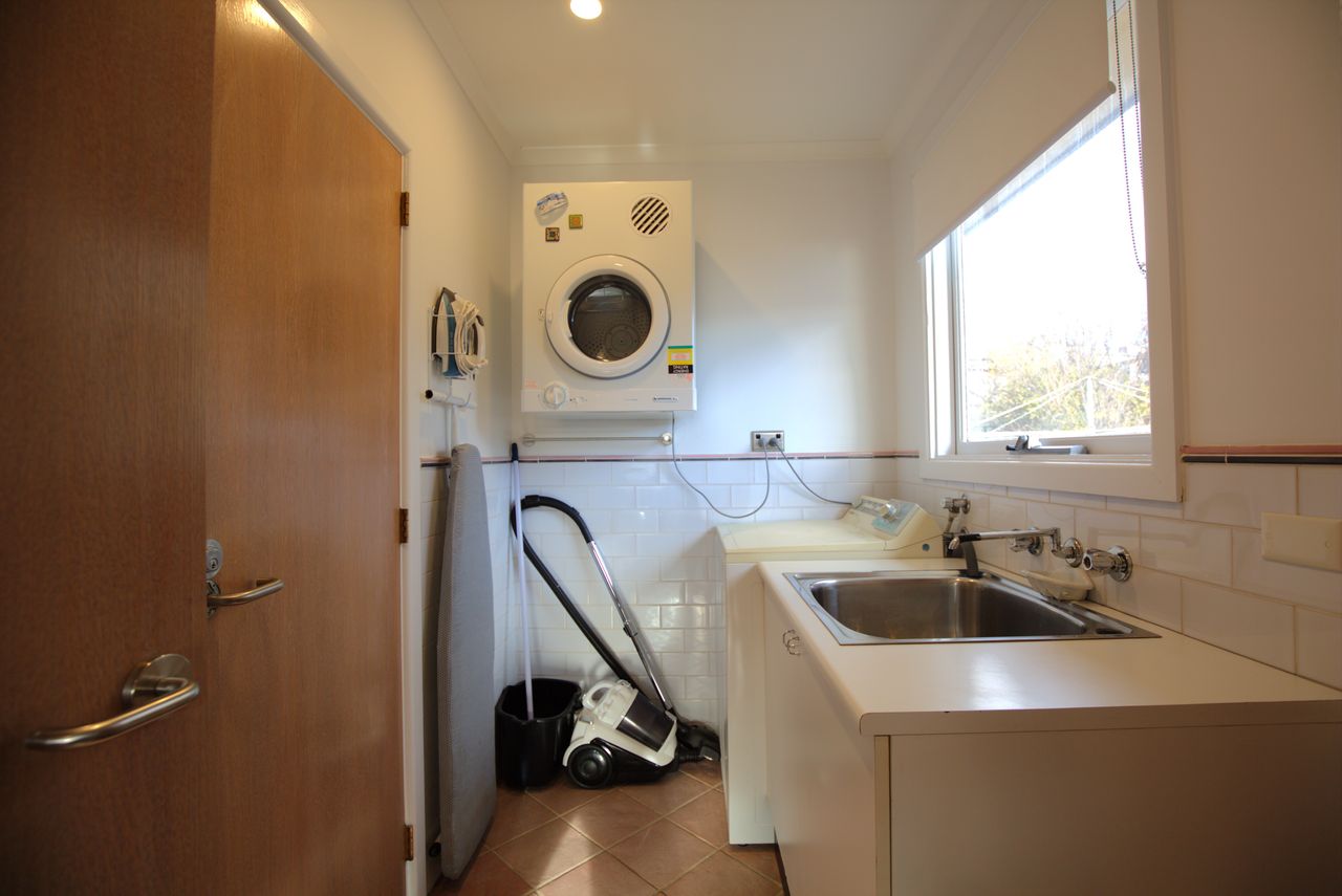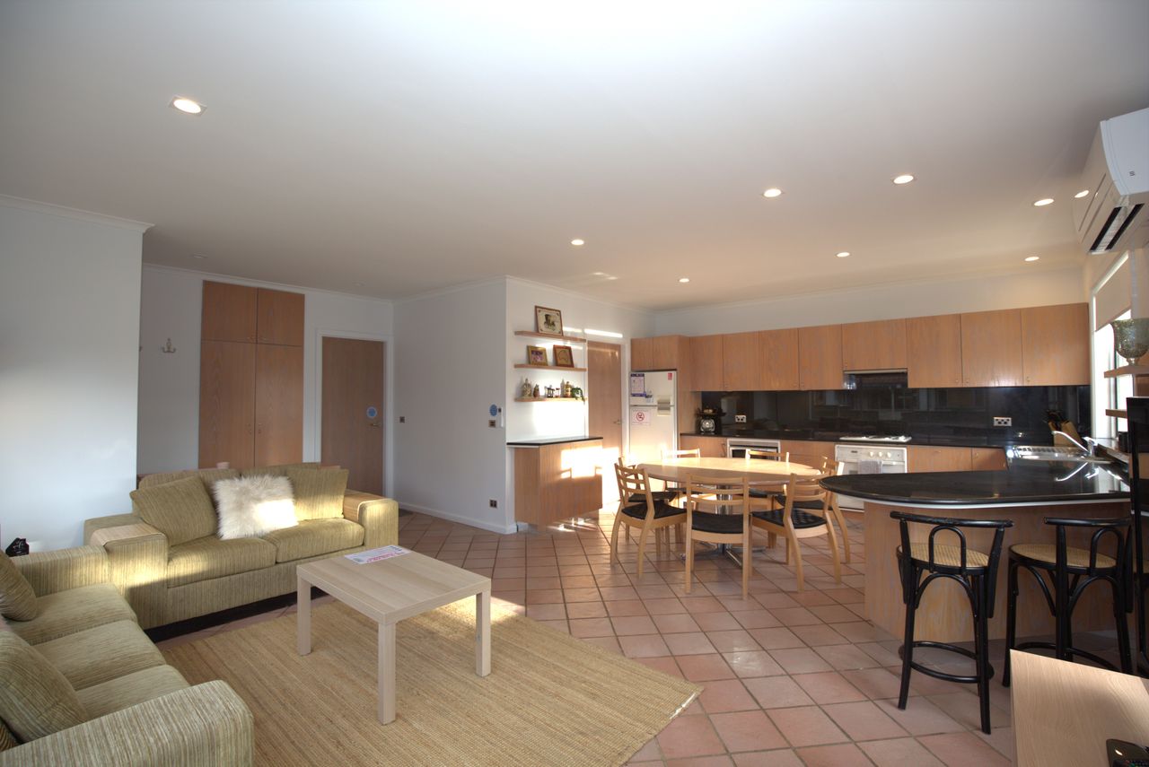 The open living and dining space includes a reverse cycle air-conditioner, electric panel heating, and plenty of natural light. Stay connected with complimentary Wi-Fi and enjoy the convenience of two full bathrooms, a full laundry with washer, dryer, and an additional guest toilet.