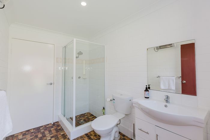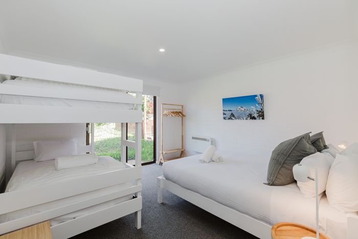 Sleeping nine guests across three bedrooms the main bedrooms is downstairs with a queen bed and set of king single bunks and direct access to the rear yard. Bedroom two with a queen bed and bedroom three with a king single and a set of king single bunks are located upstairs. All bedrooms have electric heating.