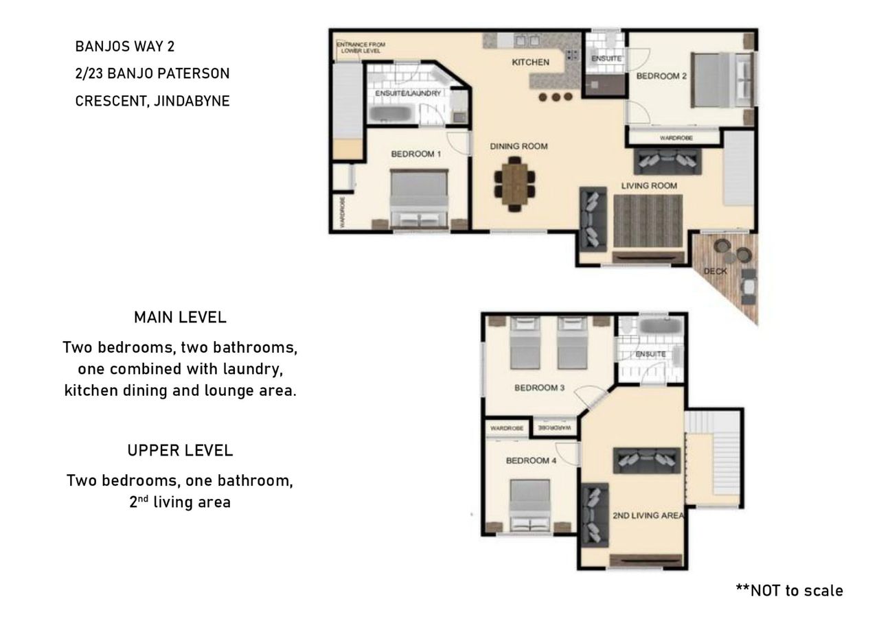 10Banjo's Way 2 is a well appointed four bedroom, two living room duplex in a central Jindabyne location. The property is configured as 2 king beds which can be split into singles on request at time of booking, 2 singles that can be made as a king on request at time of booking, 1 double and a sofa bed in the lounge to sleep a total of 10 guests. This property has free Wi-Fi; Smart TV with Netflix available for guest use. Fully appointed open-plan living/dining and kitchen area and a BBQ out on the deck. There are three bathrooms, two with full baths, and underfloor heating and reverse cycle air conditioning throughout the property. Also provided for your convenience is a separate ski storage area and drying room.