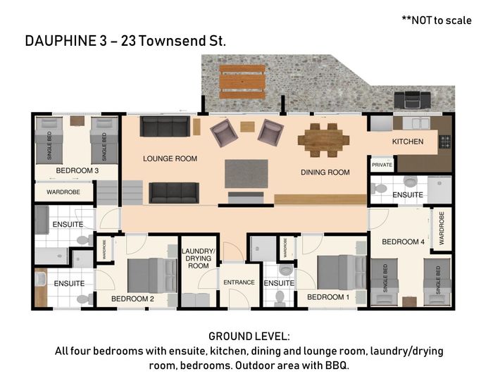 On the entry level you will find the four bedrooms, all with private ensuites and electric heating. Bedding consists of two rooms with queens and the other two with two singles each.
