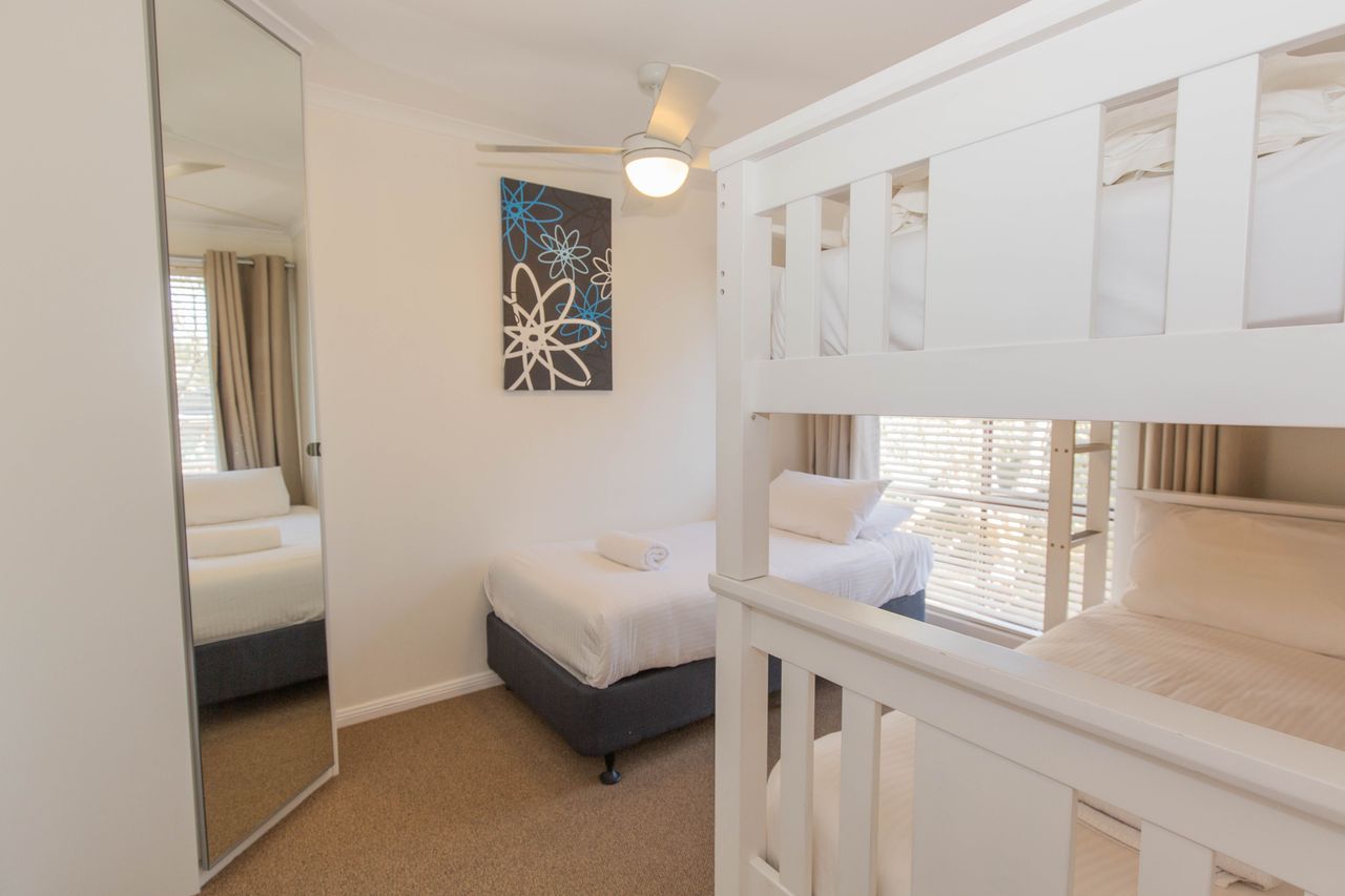 The bedrooms consists of three rooms with queen beds, one with a single and bunks and the two upstairs room with two singles each.