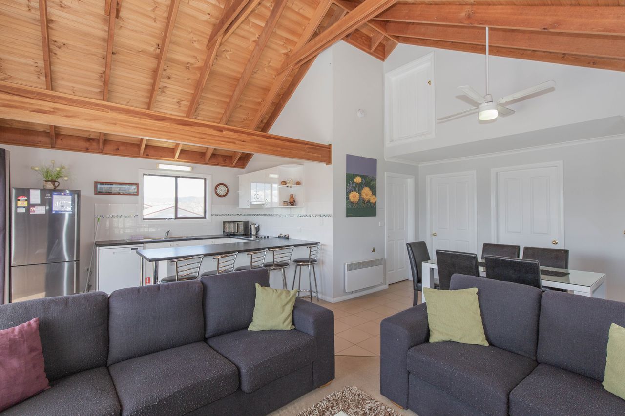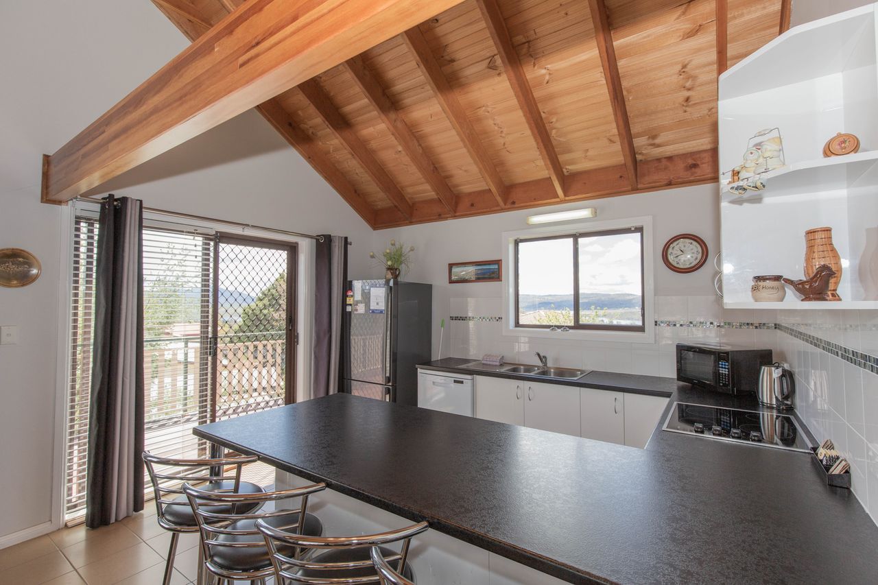 1Kestrel's Rest 2 is a renovated two bedroom holiday duplex with great lake views from the private deck. Both bedrooms have built-in robes and panel heaters on walls. The main has a queen bed and the second room has a bunk and single bed. The combined bathroom/laundry has a shower over bath.