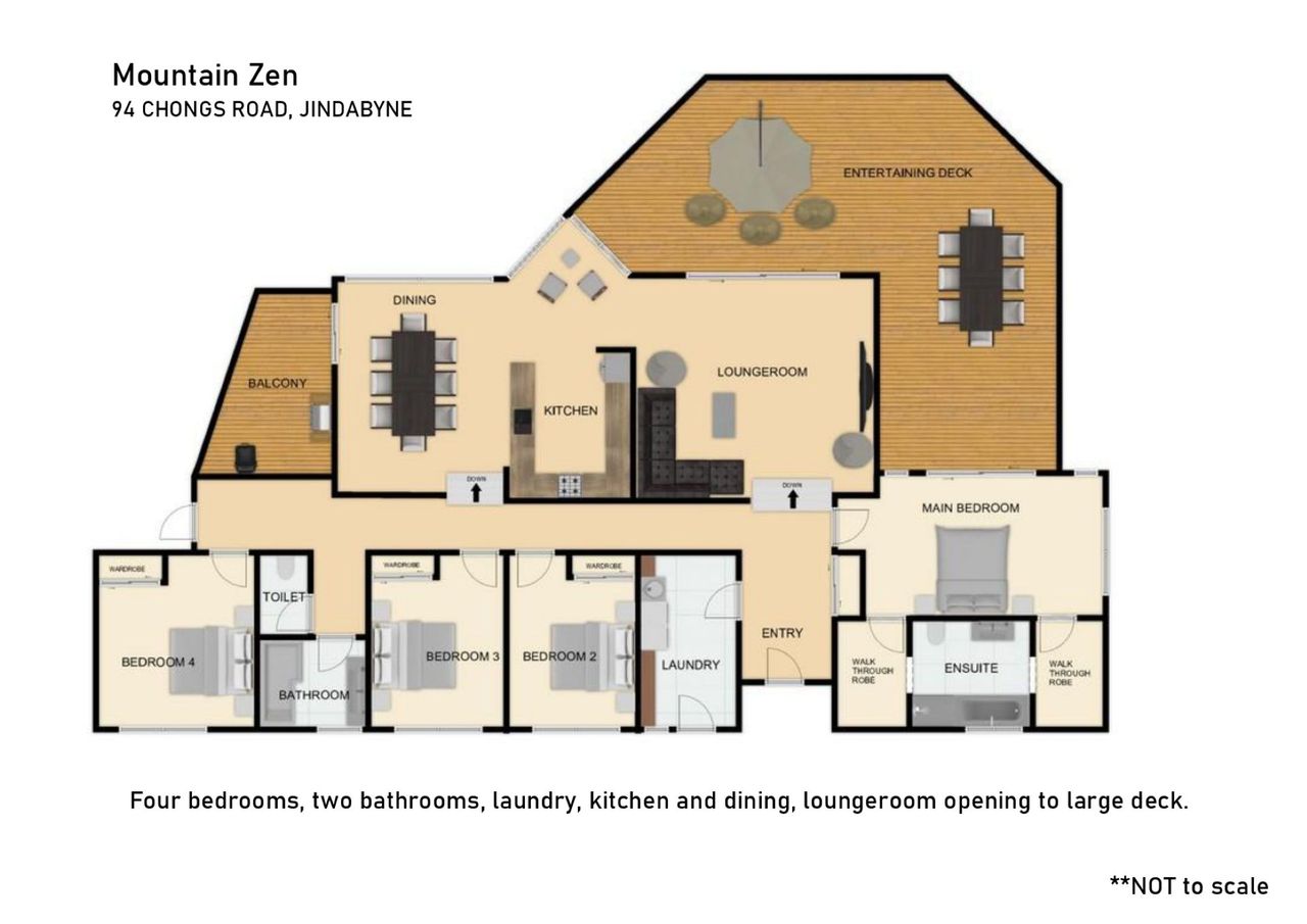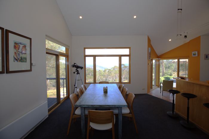 The four bedroom home is spacious offering everything you need for a summer or winter stay. As you enter, you step down in the loungeroom with smart TV, wood fireplace and looking out on the deck with views down the valley and over bushland.