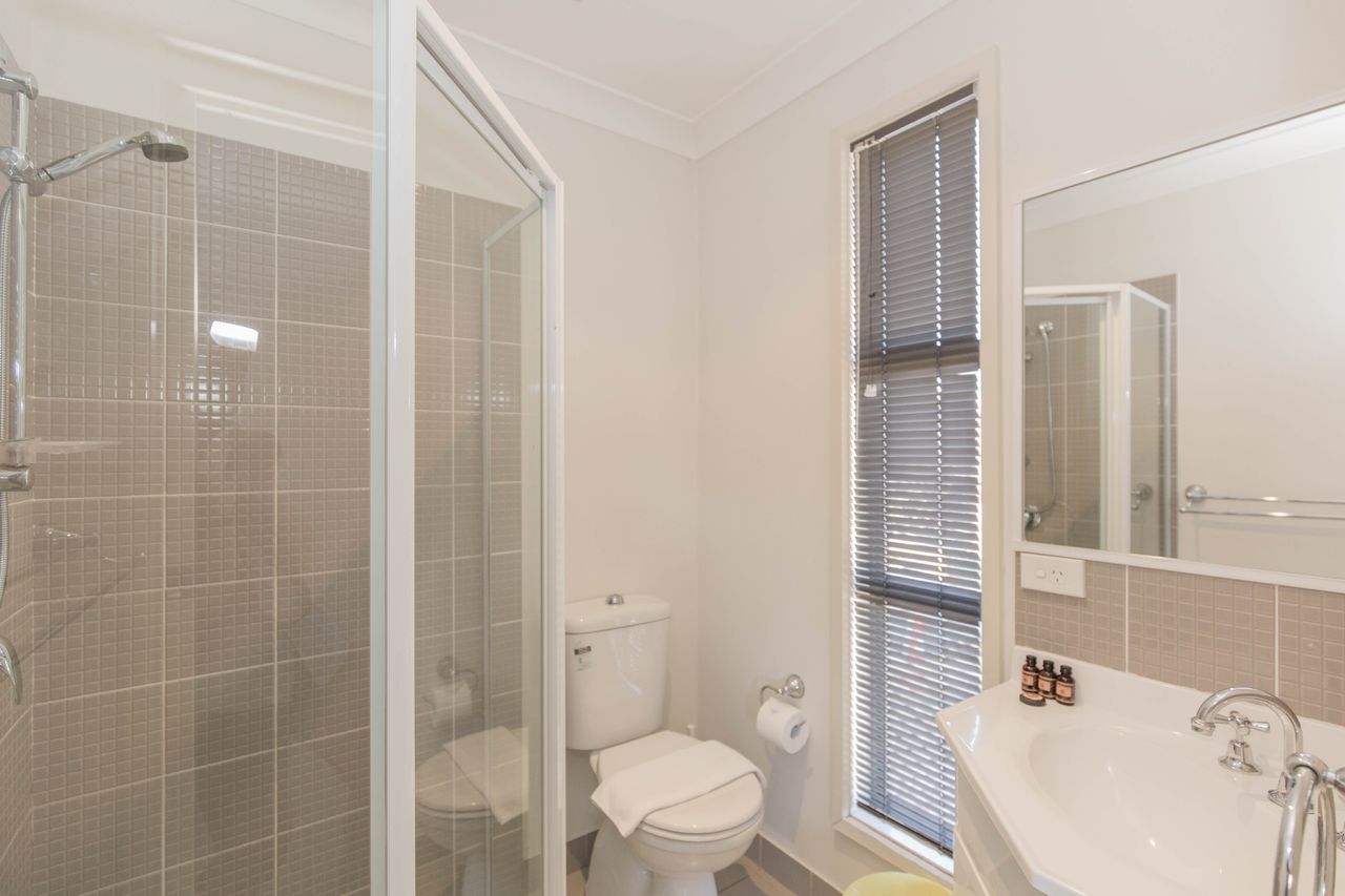 The double garage with remote access is located on the entry level and has internal access. From here you step down to the open plan living area. It features fully equipped kitchen including a dishwasher, dining table, loungeroom with a flat-screen TV, small outdoor balcony and laundry with separate toilet.