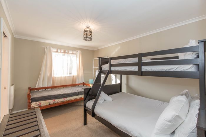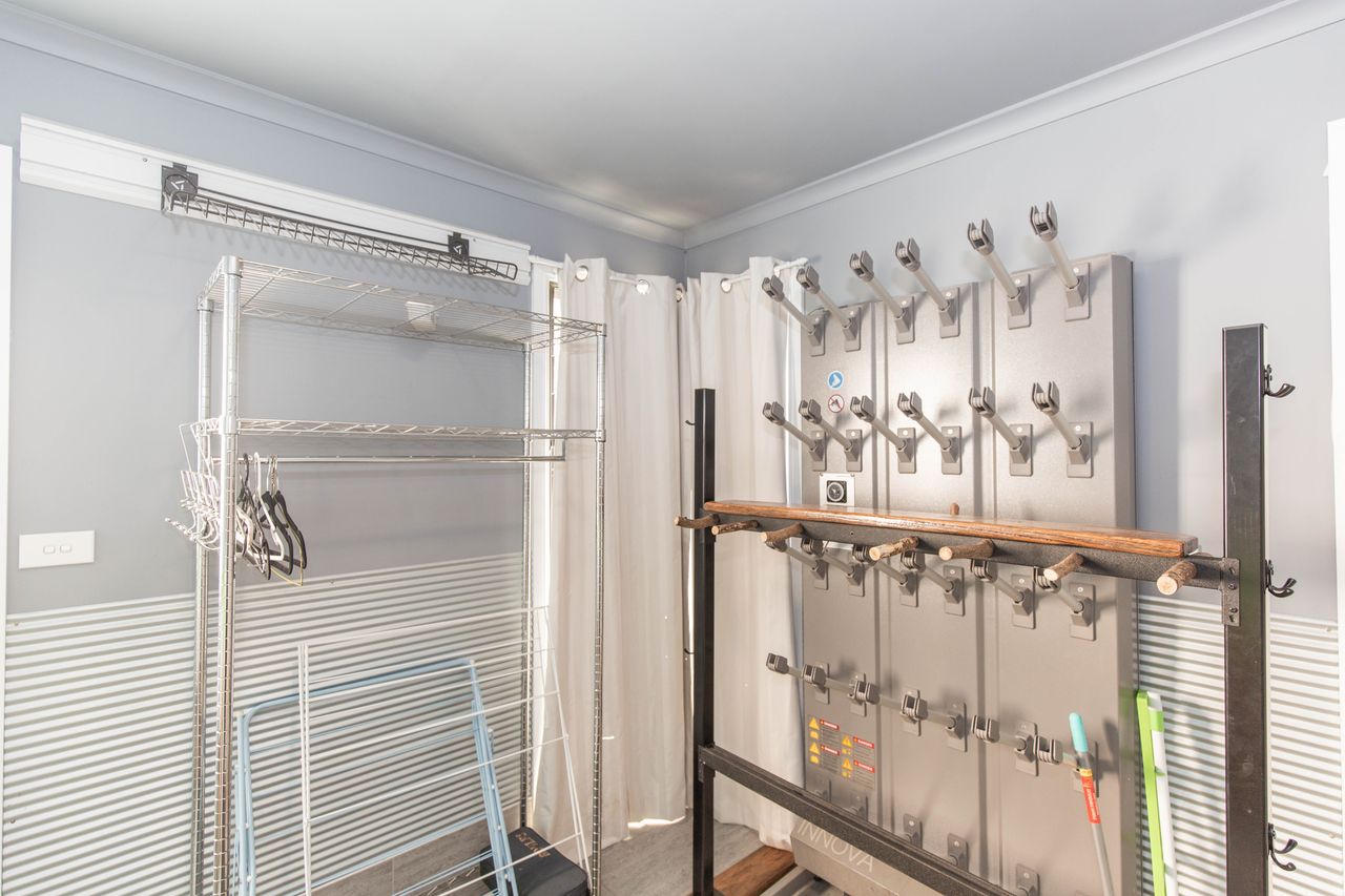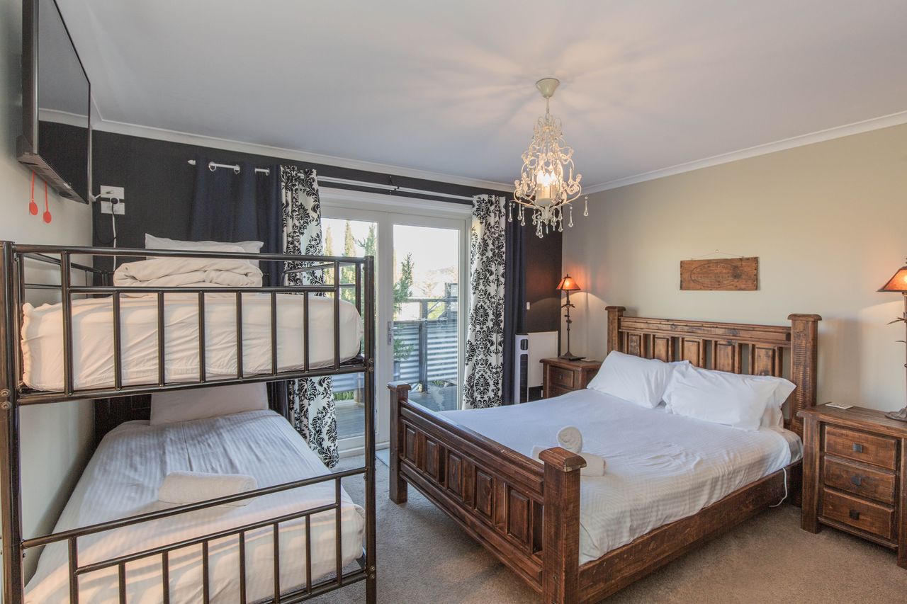 Two rooms feature a queen bed with single bunk beds and an ensuite with floor heating and a free-standing bathtub. Another bedroom features a queen bed with single bunk beds and an ensuite. The final bedroom has a tri-bunkbed with an ensuite. All bedrooms are fitted with wall heaters. A separate toilet is situated down the hallway. The laundry has washing and drying facilities and doubles as a drying room with a large electric boot dryer.