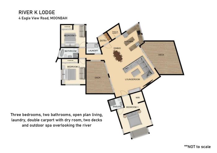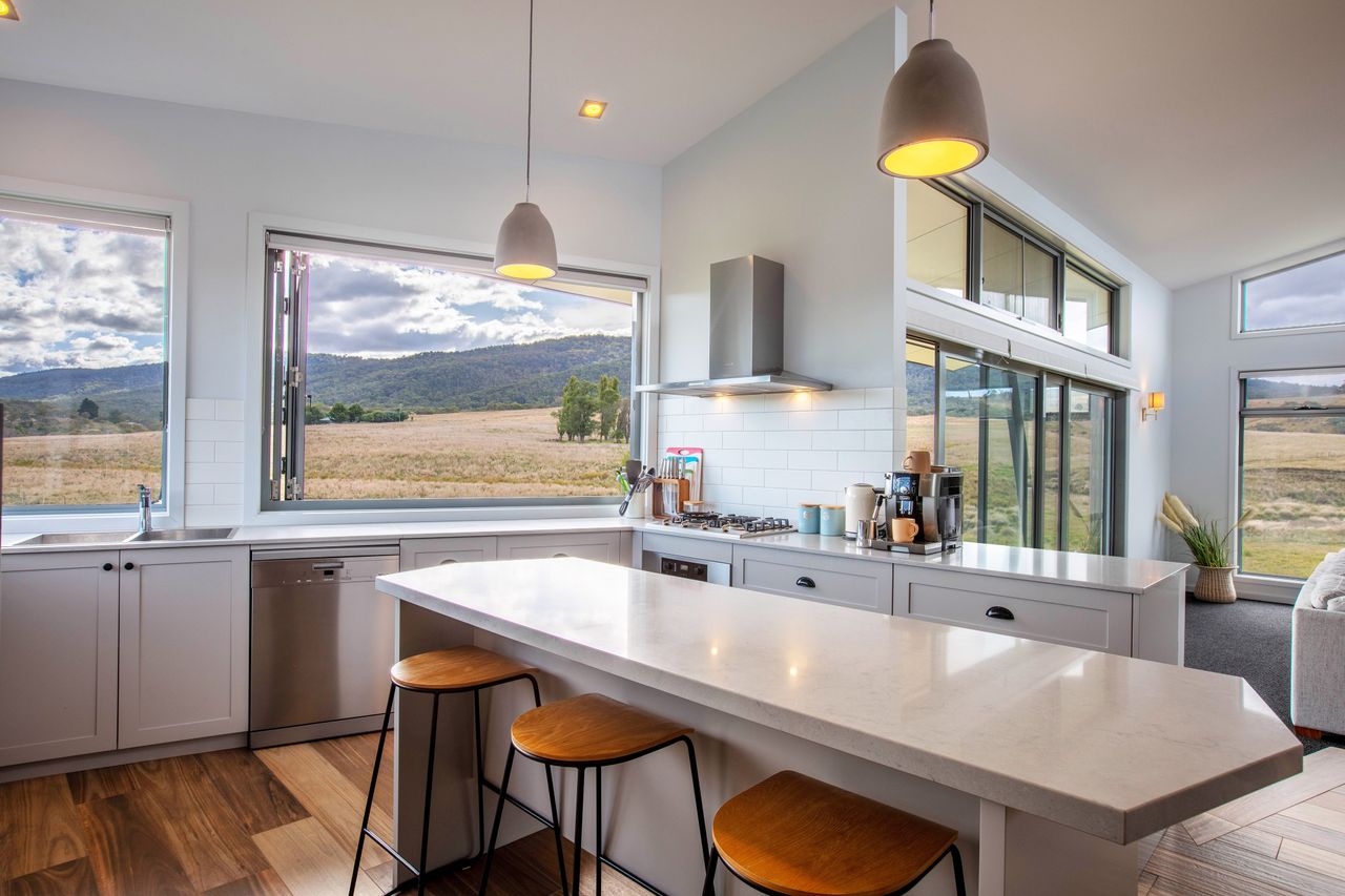 Stay with us and enjoy everything River K Lodge has to offer, with an open plan kitchen and living area, three generous bedrooms, all with scenic outlooks. The main bedroom with a queen bed, ensuite, walk in robe and a sun nook then the two remaining bedrooms each with queen beds, built in robes and 2-seater couches. Thermostat heated flooring and a built-in wood fireplace as well as reverse cycles throughout, ensures the house stays warm in the winter months.