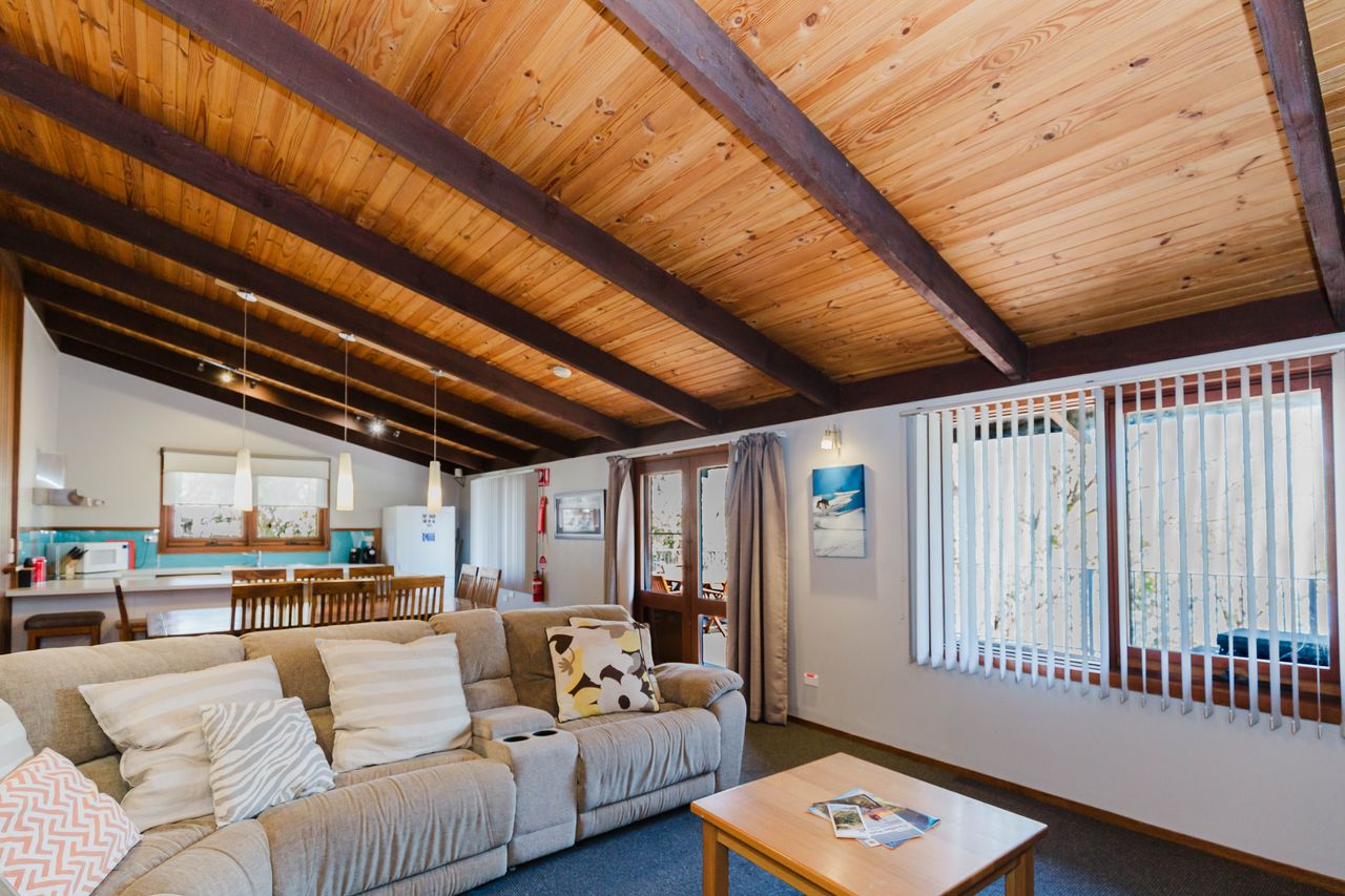 The living area is open with gourmet kitchen, dining table, lounge and a fireplace to relax by (firewood not included). All living areas and bedrooms have reverse cycle air conditioners to keep you comfortable all year round. Extra-large balcony with views over the tranquil Pooh Bay includes a BBQ, outdoor dining setting and outdoor lounge.